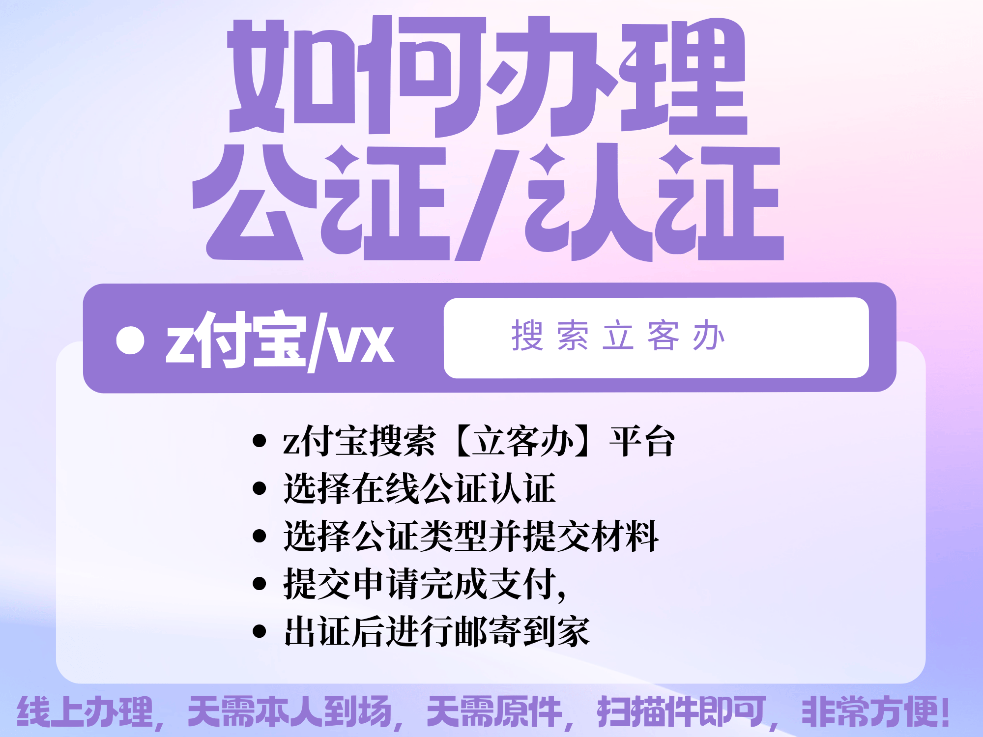 3.线上平台:随着科技发展,为了“让数据多跑路,群众少跑腿”,许多公证处都开通了线上办理渠道。如果您希望体验更加便捷的线上办理服务,也可以通过小程序搜索“立客办”来办理公证认证业务,线上提交材料,省时省力。