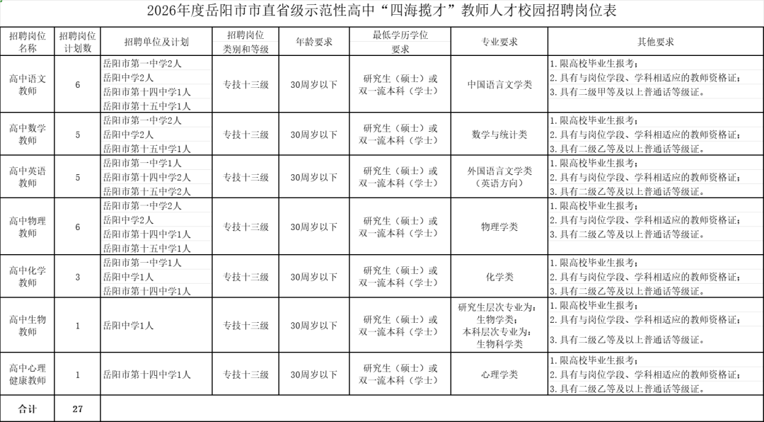此次共发布招聘岗位7个,计划招聘高中教师27人(使用全额事业编制),全部限高校毕业生报考;具体招聘岗位、计划及要求详见附件1。