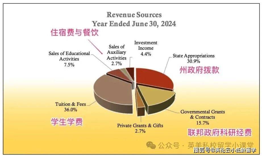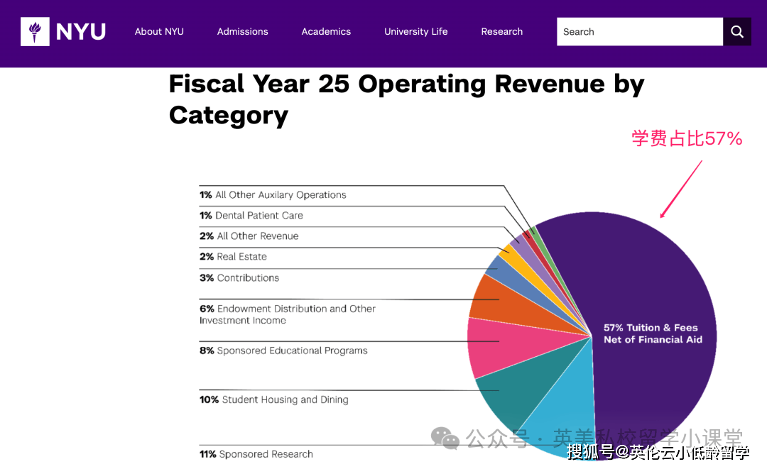 我们看看纽约大学的财报,2025年的运营收入是43亿美金,其中57%来自学生学费,另有10%来自学生住宿和伙食。