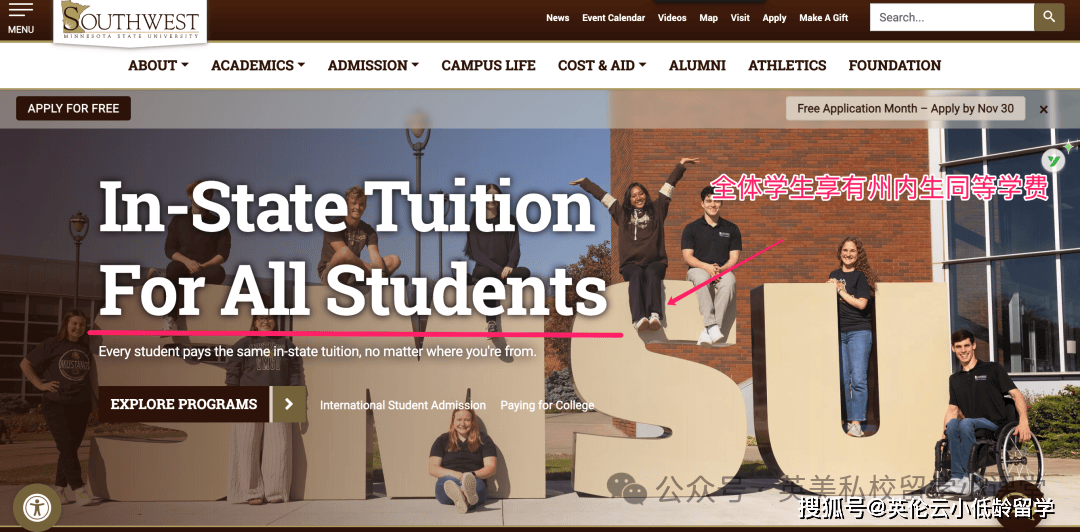 SMSU位于美国明尼苏达州西南部,公立大学,成立于1967 年。学校在官网的首页,明确写出“全体学生都享受本州生学费标准”。