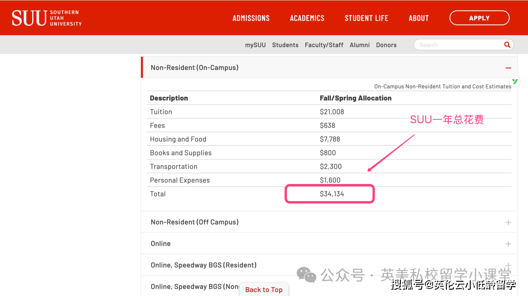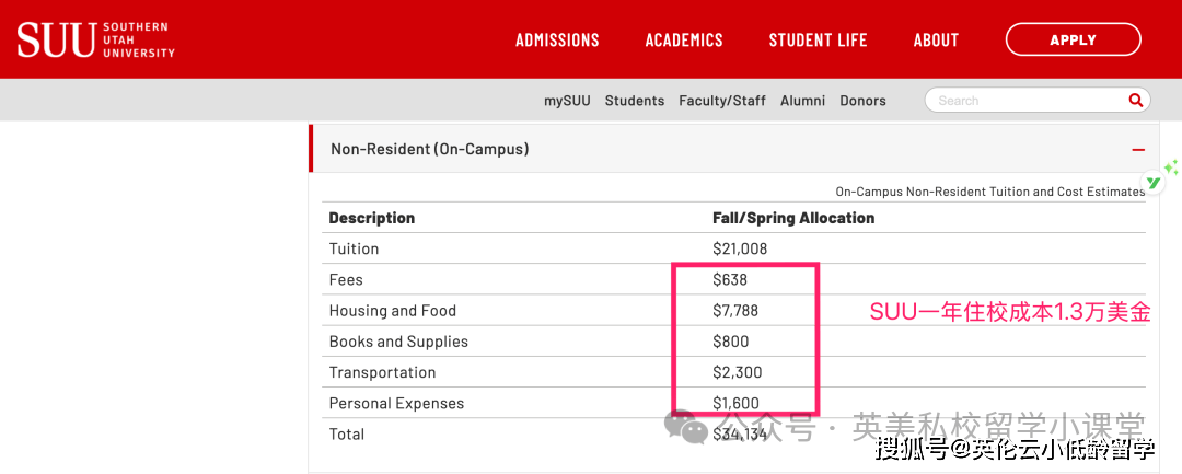 而在SUU,它位于犹他州南部的雪松城,留学生一年住校的生活成本,包含住宿、三餐、书本、交通、个人花销等,一共每年1.3万美金。
