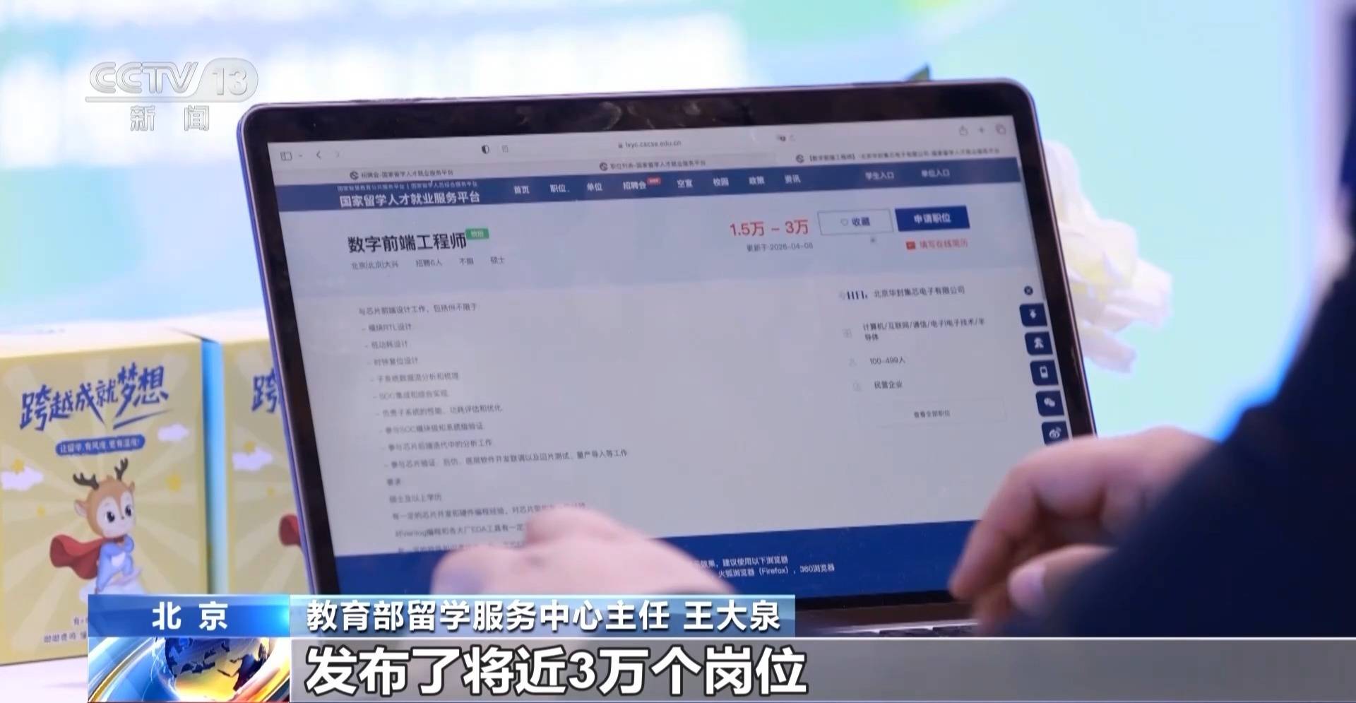 教育部留学服务中心主任 王大泉:国家留学人才就业服务平台上,目前已经注册了43万海外学生。这个线家企事业单位,发布了将近3万个岗位,向海外招聘英才,让学生和企业更好在平台上实现供需对接。