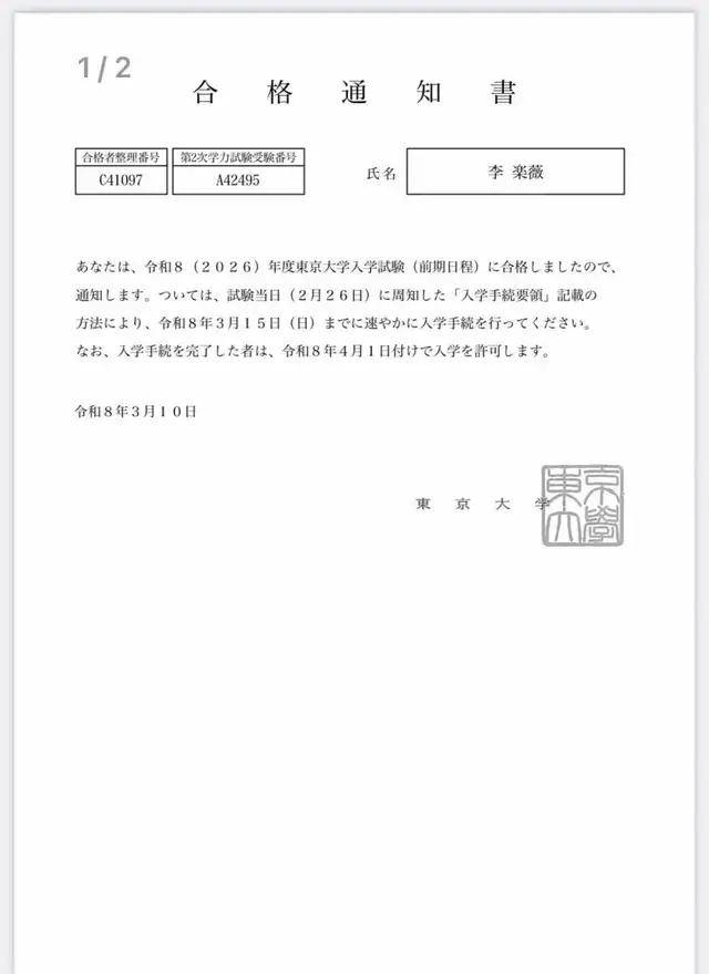 更令人振奋的是,李乐薇同学凭借优异的成绩成功考入日本最高学府——东京大学!