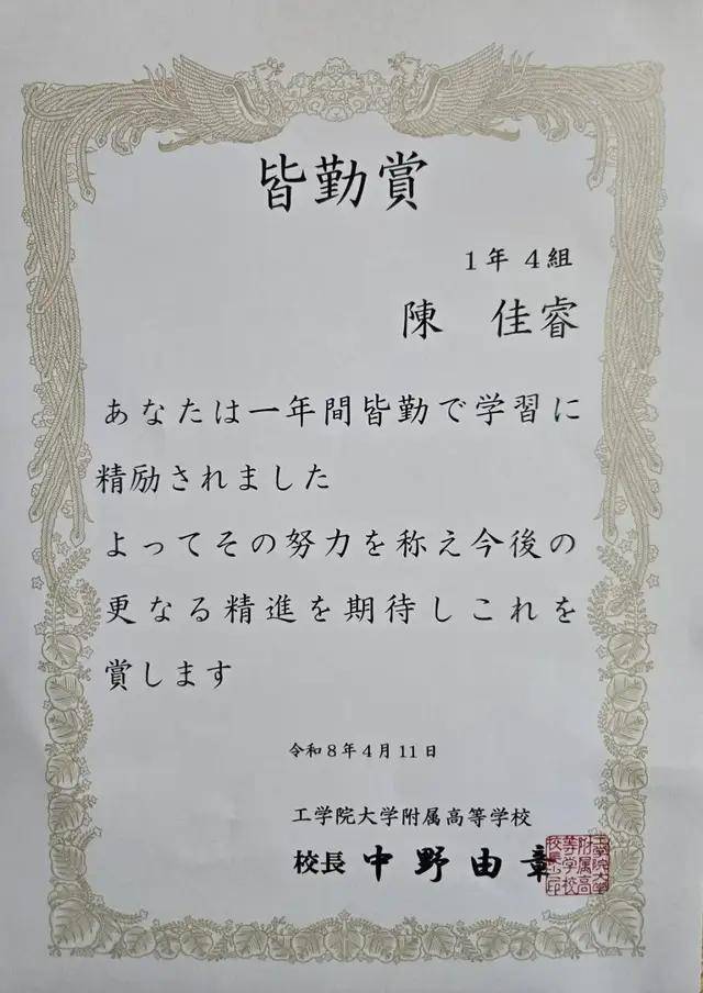 在日本高中,全勤奖是对学生自律、责任感与学习态度的最高认可之一。尤其是对于留学生而言,克服语言与文化的差异,坚持每一天准时走进教室,这份坚持尤为可贵。