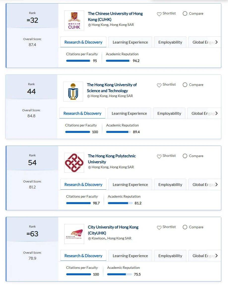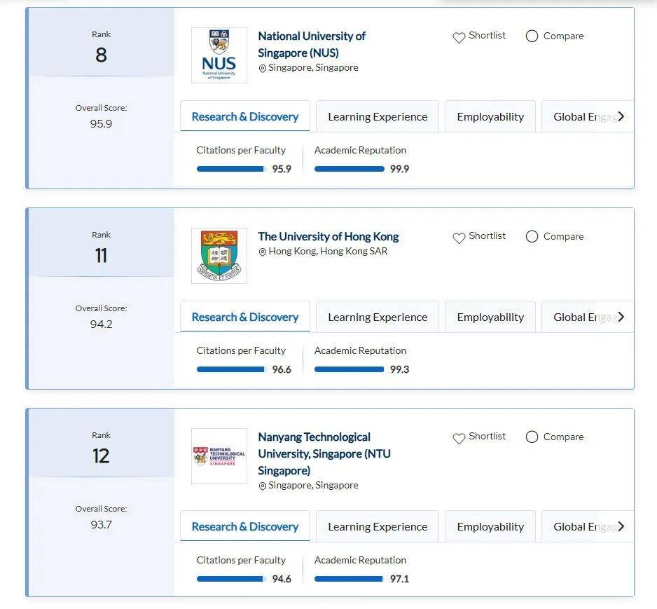 这几年港新院校在榜单上一路高歌猛进——新国立稳居全球第八,港大冲刺到全球第十一(27QS说不定能冲前十),一共七所港新院校牢牢占据前一百。